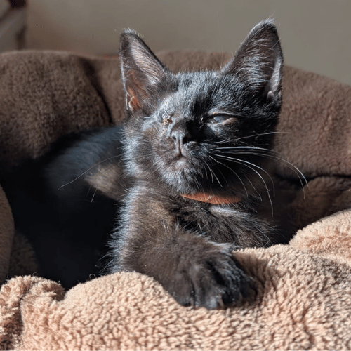 Humphrey came to us as a stray with a sore eye; our vet diagnosed him with entropion. After two surgeries and plenty of care, he recovered well and was soon adopted.